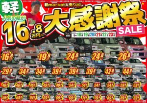 9月18日から23日まで「お客様大感謝祭セール」を開催します!今回の目玉車はお支払い総額39万8千円の平成26年式デイズやお支払い総額59万8千円の平成29年式スペーシアなど目玉車を35台もご用意しました!豪華ご成約特典などもご用意してます!軽自動車を買うならアフターサービスも充実した創業61年の軽marketで!この機会にぜひご来場下さい!