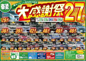 1月26日まで「お客様感謝祭セール」を開催します!今回の目玉車はお支払い総額29万8千円の平成23年式パレットやお支払い総額59万8千円の平成30年式ekカスタムなど目玉車を27台もご用意しました!豪華ご成約特典などもご用意してます!軽自動車を買うならアフターサービスも充実した創業62年の軽marketで!この機会にぜひご来場下さい!